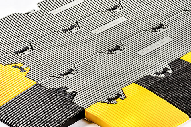 Sistema de paneles encajables, que puede instalarse sobre cualquier superficie y adaptarse a cualquier forma, creando una superficie firme y antideslizante para uso comercial, profesional y doméstico.